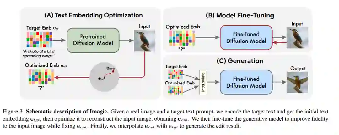 如图 3 所示,Imagic 完成上述任务只需要三步走:首先优化一个文本嵌入,使其产生与输入图像相似的图像。然后,对预训练的生成扩散模型进行微调,以优化嵌入为条件,更好地重建输入图像。最后,在目标文本嵌入和优化后的嵌入之间进行线性插值,从而得到一个结合了输入图像和目标文本的表征。然后,这个表征被传递给带有微调模型的生成扩散过程,输出最终编辑的图像。