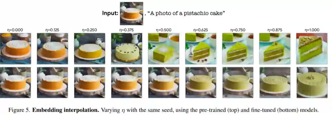 这里要注意的是,此处所获得的优化嵌入 e_opt 在通过生成扩散过程时,不一定会完全和输入图像 x 相似,因为它们只运行了少量的优化步骤(参见图 5 中的左上图)。因此,在第二个阶段,作者通过使用公式 (2) 中提供的相同损失函数优化模型参数 θ 来缩小这一差距,同时冻结优化嵌入。