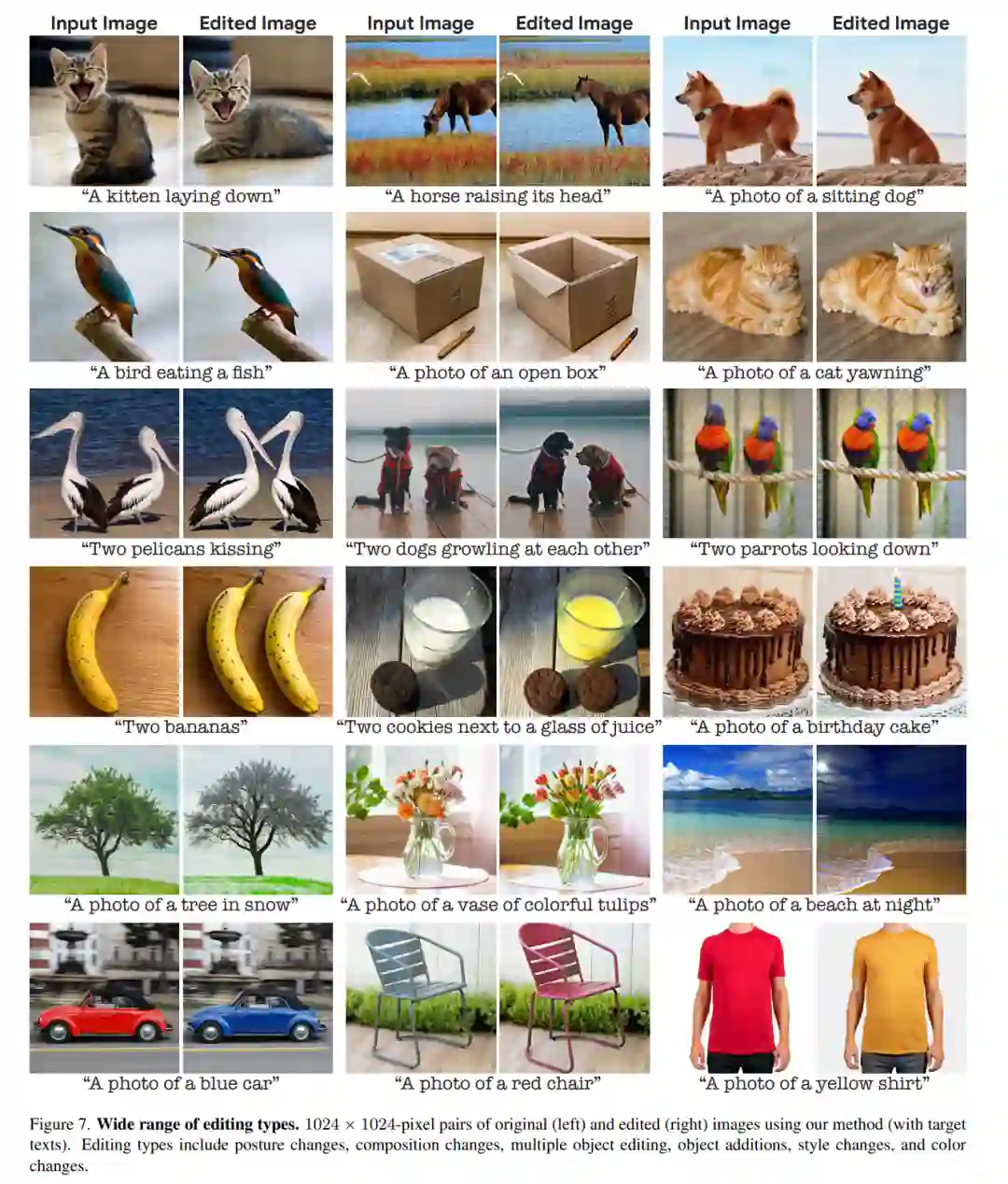 为了测试效果,研究者将该方法应用于来自不同领域的大量真实图片,用简单的文字 prompt 来描述不同的编辑类别,如:风格、外观、颜色、姿势和构图。他们从 Unsplash 和 Pixabay 收集了高分辨率的免费使用的图片,经过优化,用 5 个随机种子生成每个编辑,并选择最佳结果。Imagic 展示了令人印象深刻的结果,它能够在任何一般的输入图像和文本上应用各种编辑类别,如图 1 和图 7 中所示。