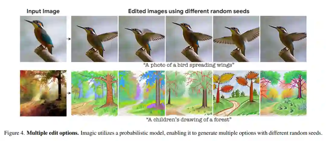 图 2 中是对同一张图片进行了不同的文字 prompt 实验,显示了 Imagic 的多功能性。