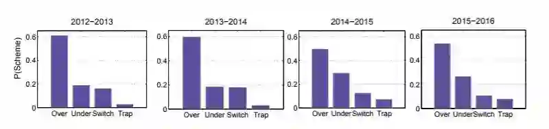 然后作者手动标记了四种类型的若干样本,并进一步训练构建了分类器来发现更多的挡拆。最终识别结果如下:全部270823个挡拆,“挤过”146314个,“绕过”69721个,“换防”37336个,“包夹”17451个。对这些进一步分析可以得到以下一些有趣的结论: