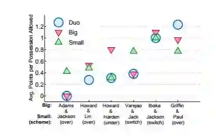 下图比较了不同防守组合面对挡拆的每回合失分以及他们各自与所有球员搭档的平均每回合失分。克里斯-保罗和布雷克-格里芬是使用挤过的效果是最差的之一,平均失去1.2分。另外伊巴卡和雷吉-杰克逊组合的换防很差,但各自挡拆防守效率很接近。【题外话,如今这两对组合已经都被拆散了,是不是经理看到了这个研究?】