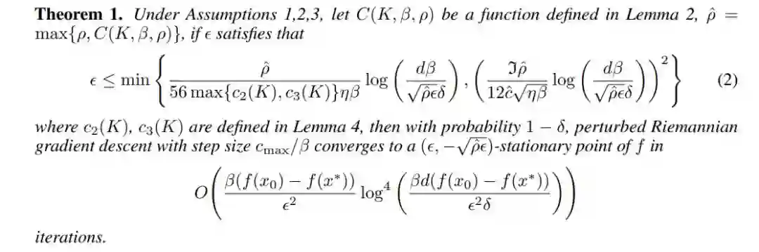 ρ 与参数 ϵ 直接相关,扰动后的黎曼梯度下降(perturbed Riemannian gradient descent)算法将以 1/(2 ϵ^2) 的速率避开鞍点。