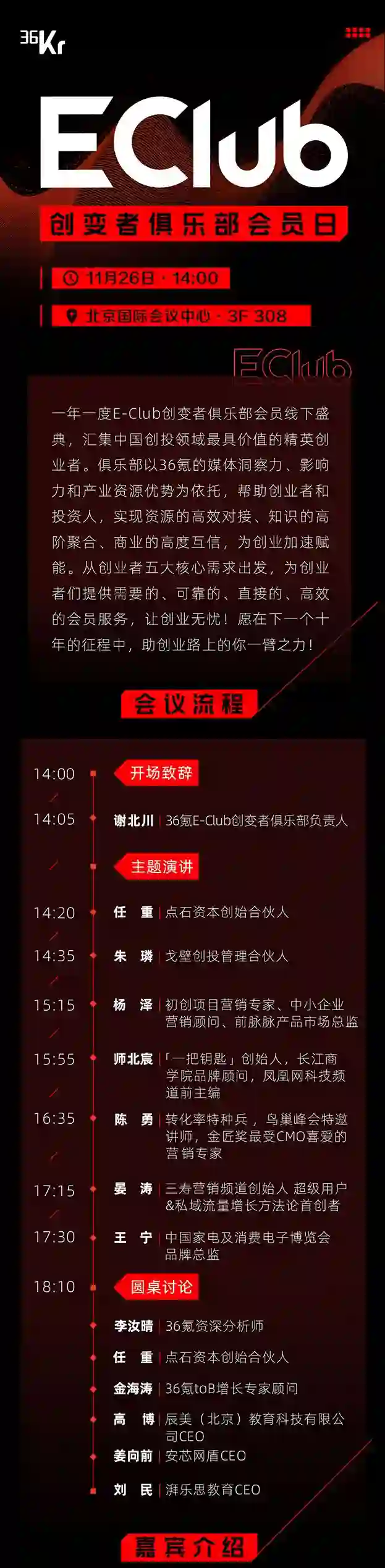 36氪「E-Club创变者俱乐部」将持续以36氪的媒体洞察力、影响力和产业资源优势为依托,帮助创业者和投资人,实现资源的高效对接、知识的高阶聚合、商业的高度信任,与创业者相互赋能,共同成长。
