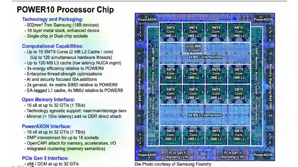 IBM 在 Hot Chips 会议上展示了 POWER10 的大量技术细节。芯片面积为 600 平方毫米,具有 180 亿个晶体管。最多两个管芯可以被放入 POWER10 服务器的包中。