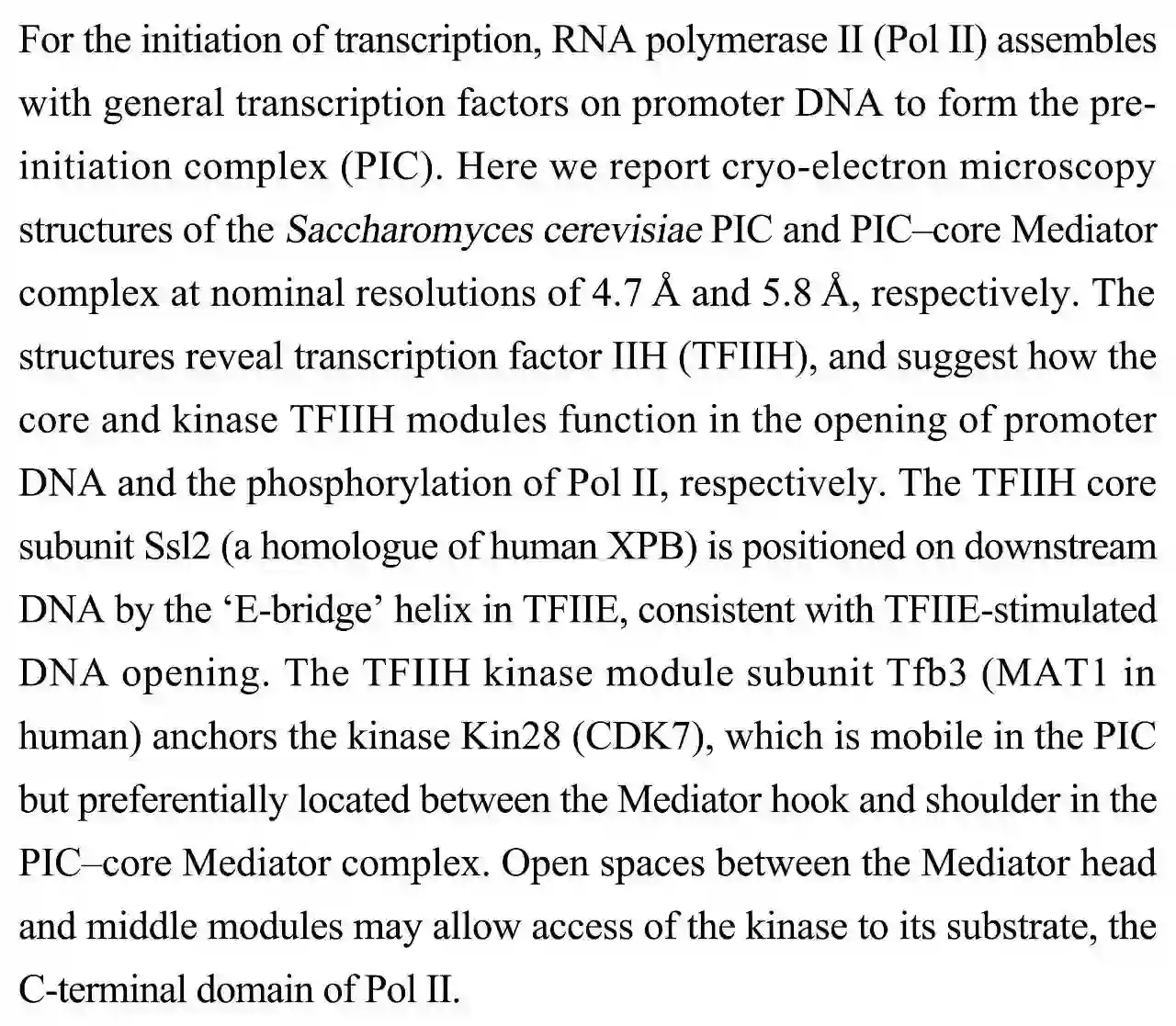 (导读 郭怿暄)在基因转录启始过程中,RNA 聚合酶II(RNA Pol II)首先与多种转录因子结合于启动子 DNA 上形成转录启始前复合物(PIC)。本研究利用冷冻电镜,解析了酵母 PIC,以及 PIC-核心中介体(Mediator)复合物的结构,进一步揭示了 TFIIH 核心和蛋白激酶亚基打开启动子 DNA 和磷酸化 Pol II 的分子机制。