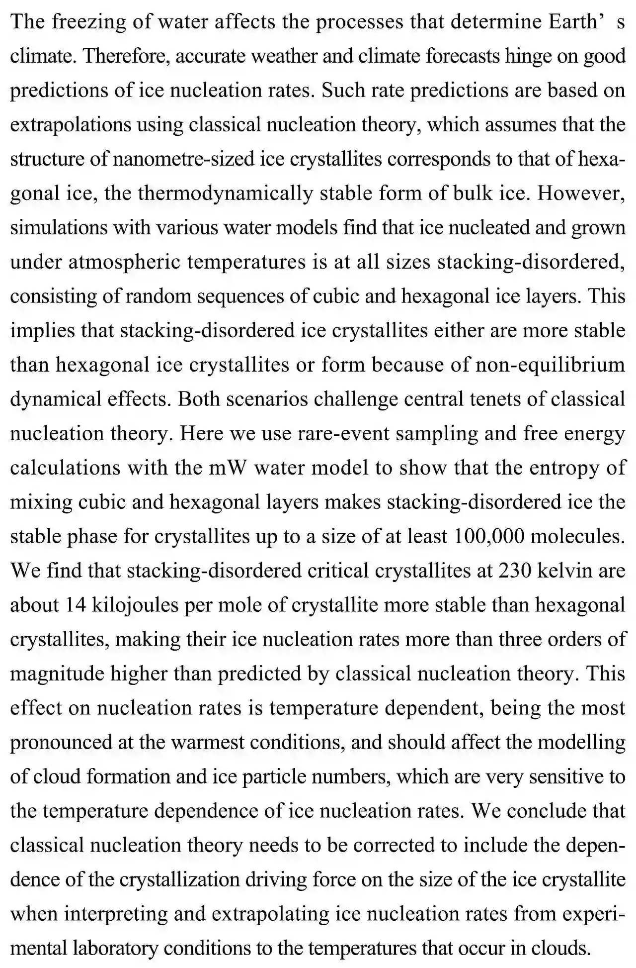 (导读 阿金)准确的天气和气候预报依赖于对冰成核速率的稳定预测。各种模型的模拟表明,在大气温度下,冰核的形成和生长都是无序堆积的:由立方和六方冰层随机堆叠而成。本研究报告一个简单的水模型的模拟和能量计算,表明无序堆积的冰晶比六角冰晶更稳定,且成核率比经典理论的预言高出 3 个数量级。该结果表明经典成核理论亟待修正。