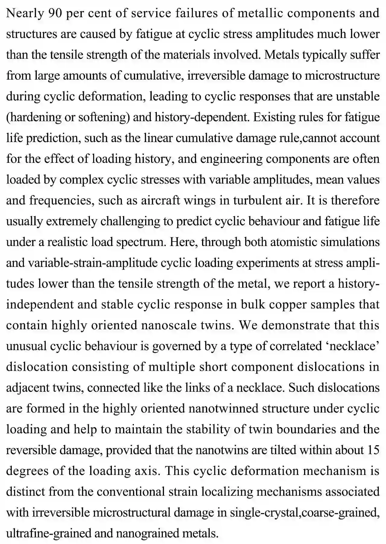 (导读 阿金)在循环应力下的材料疲劳,常被认为是由不稳定的损伤累计形成的历史依赖过程。本研究通过在低于金属拉伸强度的应力幅值下的原子模拟和拉-压变幅应变控制实验,发现含有高度取向的纳米孪晶铜与疲劳历史无关的稳定循环响应,其内部的位错结构有助于保持双边界的稳定性和可逆损伤。