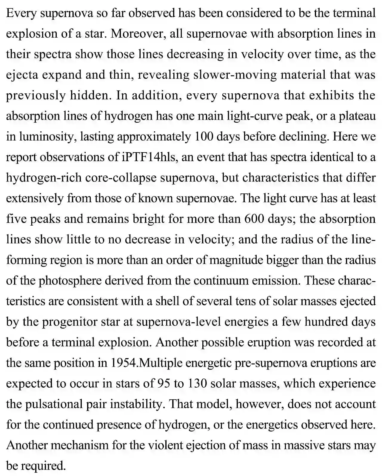 (导读 阿金)一般认为,超新星是恒星演化的最后阶段,爆炸产生的光亮会持续 100 天,随后变得黯淡。本研究观测到超新星 iPTF14hls 的特殊爆发事件,光谱显示这是颗富氢的核坍缩超新星。但不同寻常的是,它的持续发光时间超过 600 天,光变曲线至少有五个峰;吸收谱线显示喷射物并无降速迹象;总爆发能量是普通超新星的百倍。该发现对研究超新星的形成和爆发机制提出新的挑战。