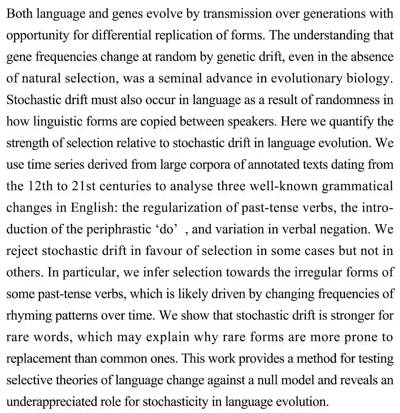 (导读 郭怿暄)与基因类似,语言在世代相传中可能产生不同复制,随机漂变对语言进化的影响尚不清楚。本研究量化分析了语言进化中随机漂变相关的选择力度,针对大量 12-21 世纪语言资料中三种重要的语法变化展开研究,发现漂变对罕见词汇具有更大影响,使其更容易被取代。这不但提供了语言变化的理论验证方法,还解释了随机在语言进化中的作用。