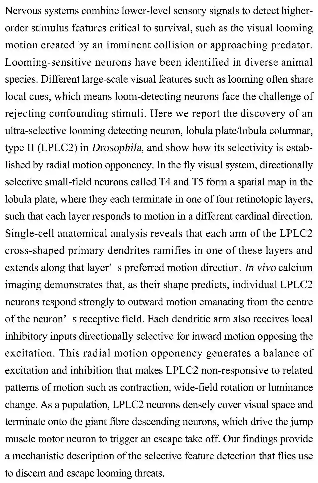 (导读 卓思琪)感受危险逼近的危险探测神经元常需要处理体内混乱的信息传递。本文报道了果蝇的一种危险探测神经元 LPLC2,发现单个 LPLC2 神经元对向外运动产生强烈响应,而每个树突臂可以接受来自相反运动方向输入的抑制信号。相反的径向运动产生的兴奋和抑制平衡使 LPLC2 对其他杂乱运动模式无响应,从而为果蝇对危险的识别逃脱的特异性探测提供了一个机理性的描述。