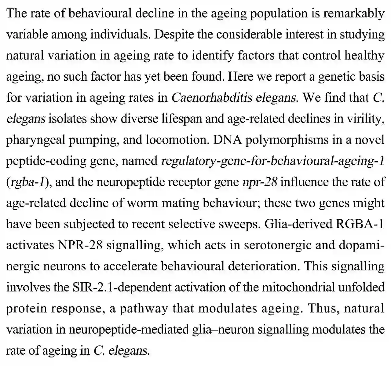 (导读 阿金)每个生物个体的衰老速度差异极大,而导致差异的因素仍未被确定。本研究报道在秀丽隐杆线虫中发现源自神经胶质的 rgba-1 神经肽会激活多巴胺神经元和羟色胺能神经元上的 NPR-28 受体,从而加速行为的退化。这表明遗传变异可以调节线虫的年龄依赖性衰老,为理解健康老化的生物学基础带来了新见解。