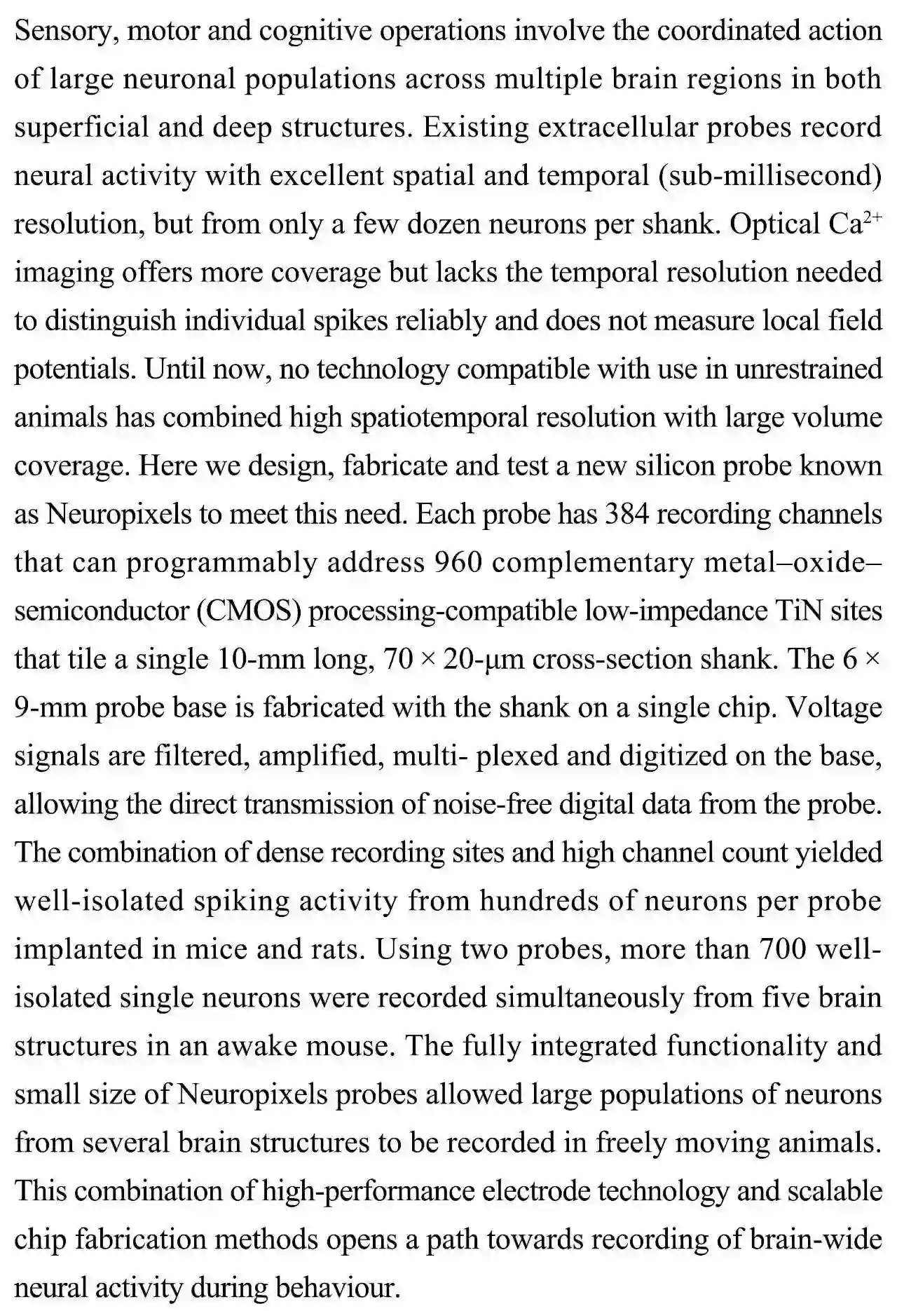 (导读 唐诗语)在自由活动的动物身上进行大面积、高时空精度的脑神经活动探测在此前尚未实现。本研究设计制造了集成于单一 6 × 9 mm芯片基板的硅探针 Neuropixels,它能够同时准确探测和处理几百个神经元的信号。使用两支探针,研究者对一只清醒小鼠 5 个不同脑区中超过 700 个独立神经元的活动进行了记录。