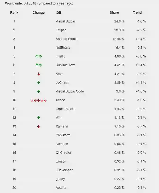 PYPL 7 月最新 IDE 指数已发布,搜索最多的前三大 IDE 依然是 Visual Studio、Eclipse 和 Android Studio 。其中,Visual Studio 和 Eclipse 的指数再次拉近,仅相差 0.7% 。
