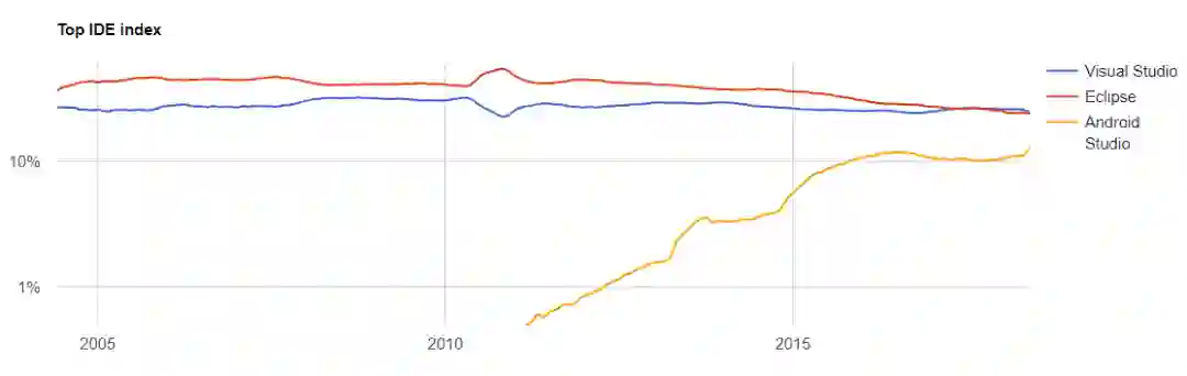 PYPL 指数是非常流行的参考指标之一,原始数据基于 Google trends 。“ Top IDE Index” 是 PYPL 通过分析在 Google 上搜索 IDE 的频率(次数)而生成,IDE 被搜索越多,则认为越流行。