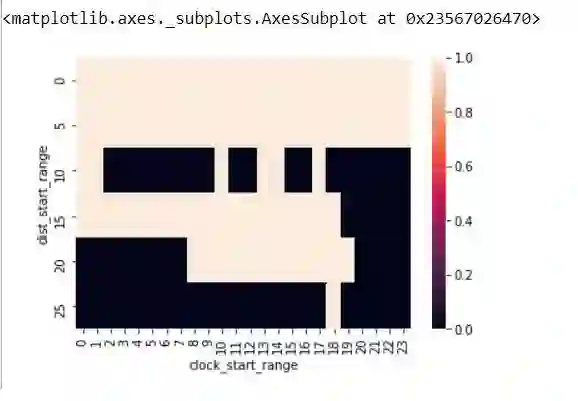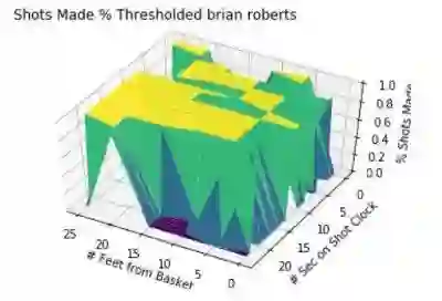 一旦我们获得了新的数据帧,所有投篮都被SHOT_DIST和SHOT_CLOCK组织成144个独特的分区。 投篮距离分为6个距离范围<5英尺,5-10英尺,10-15英尺,15-20英尺,20-25英尺和25-30英尺。时间分为24个区间,每个区间1秒钟 ,从0-24秒。 然后将每个区间映射到该区间中投篮的进球量以及投篮的量。