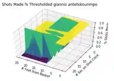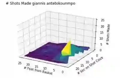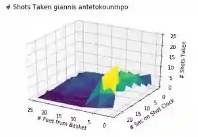 使用这些图形,我们可以确定哪些玩家了解他们从哪个区域有效,以及哪些球员始终从他们缺乏技能的区域拍摄,以便始终如一地进行转换。 在Giannis Antetokounmpo(字母哥)的情况下,我们可以看到他的大部分投篮都接近篮筐,大部分时间仍然留在投篮时间。 Giannis作为一名高效的球员有着良好的声誉,这张图表显示他的绝大多数投篮都接近篮筐而且他是一名出色的射手。