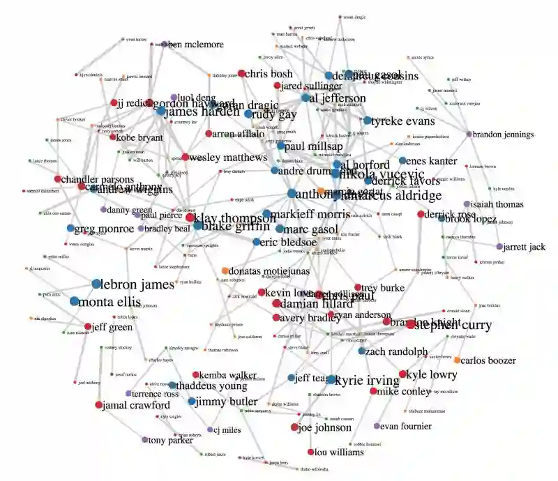 蓝色节点代表在篮筐附近完成大部分得分的球员。虽然这个小组主要由大个子组成,但是像Kyrie Irving和James Harden这样的一些突破手都属于这一类。大多数作为大个子的蓝色节点都是高度相关的,这意味着大个子通常会在其他中锋和大前锋上得分。这是有道理的,因为这些球员经常互相保护,并且在大多数防守球员身上往往靠近篮筐。