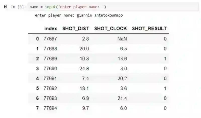 为了评估个人球员的表现,我们希望收集更多关于他们所投篮镜头的背景信息。在深入研究之前,我们首先必须使用特征提取来开发数据,详细说明球员的平均投篮距离,每个区域的投篮百分比,以及他们能够从各个区域进行投篮的次数。这些信息让我们更全面地了解了球员在游戏中通常采取的类型。然后,我们创建了一个模块,该模块采用输入播放器名称,并将其投篮距离,投篮时间和投篮结果数据输出到新的数据帧中。我们工具的屏幕截图如下所示:
