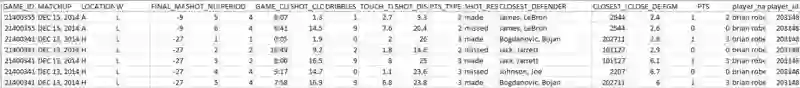 除了NBA网站之外,很难找到像我们使用的数据那样的原始空间拍摄数据。不幸的是,几年前NBA终止公开其API。我们需要抓取他们的网站来获取当前数据。我们对项目的分析和可视化方面比抓取更感兴趣,因此我们使用了2014-2015赛季的数据集,该数据集是在公共API仍然可用时获得的。我们的分析可以很容易地扩展到新数据,因为它可用。下面可以看到数据集的示例。