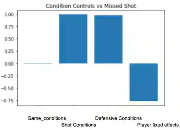 投篮条件和防守条件(分别以距离和后卫技能为特征)对射门难度产生相对相等的贡献,并且球员自有水平(真实投篮命中率)在投篮条件和防守条件的贡献中约为75%。