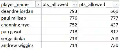 我们想要开始我们的分析,只需简单评估一下NBA中一些最好的攻防一体球员可能在2014 - 2015年。一个好的攻防一体球员是对进攻和防守都有效的球员。我们决定通过创建包含三个功能的数据框来实现此目的:{player_id,pts_scored,pts_allowed}。通过对SHOT_RESULTS列中每个“制作”栏目的所有PTS_TYPE特征求和,计算每个玩家的得分。允许的积分是通过将每个制作的栏目相加来计算的,其中给定的玩家在CLOSEST_DEFENDER功能中列出。下面是新数据框的一个示例:
