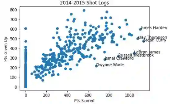 正如预期的那样,一些最精英的攻防一体球员如德维恩·韦德,拉塞尔·威斯布鲁克和勒布朗·詹姆斯被列在图的右下角,因为他们得分很多,但没有被列为最接近的防守者。其他球员如Klay Thompson,Steph Curry和James Harden也被列出。虽然这些球员的防守效果不是很好(根据这个分析),但他们的得分能力使他们与其他球员处于精英阶层。