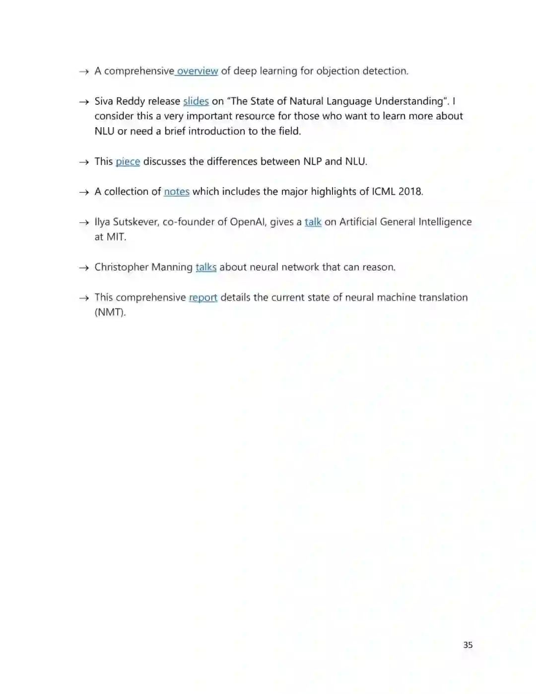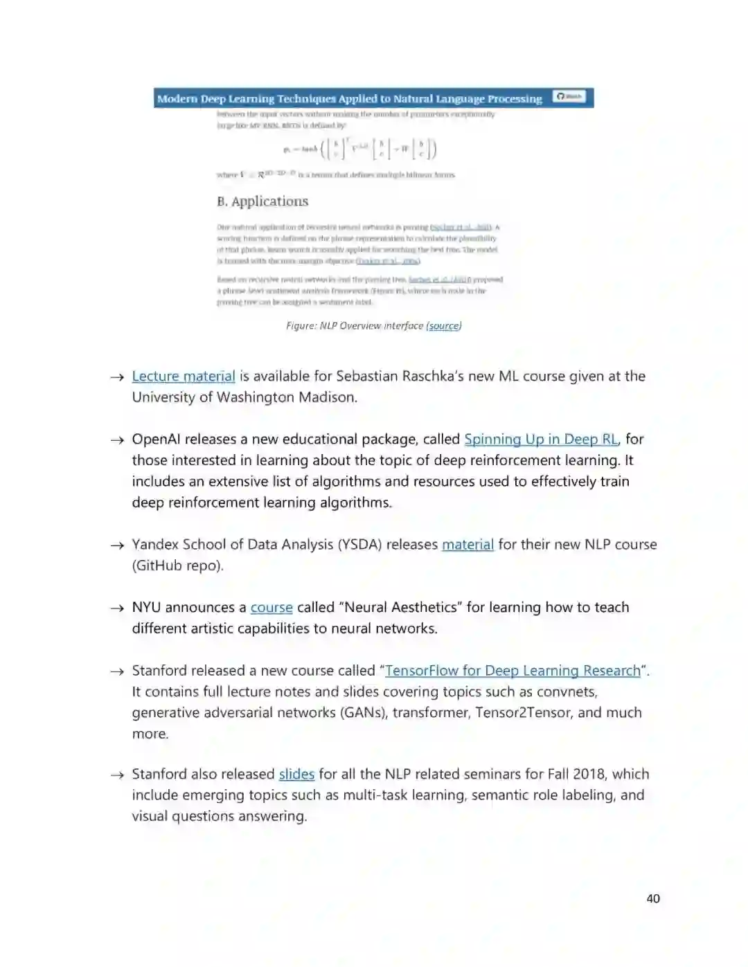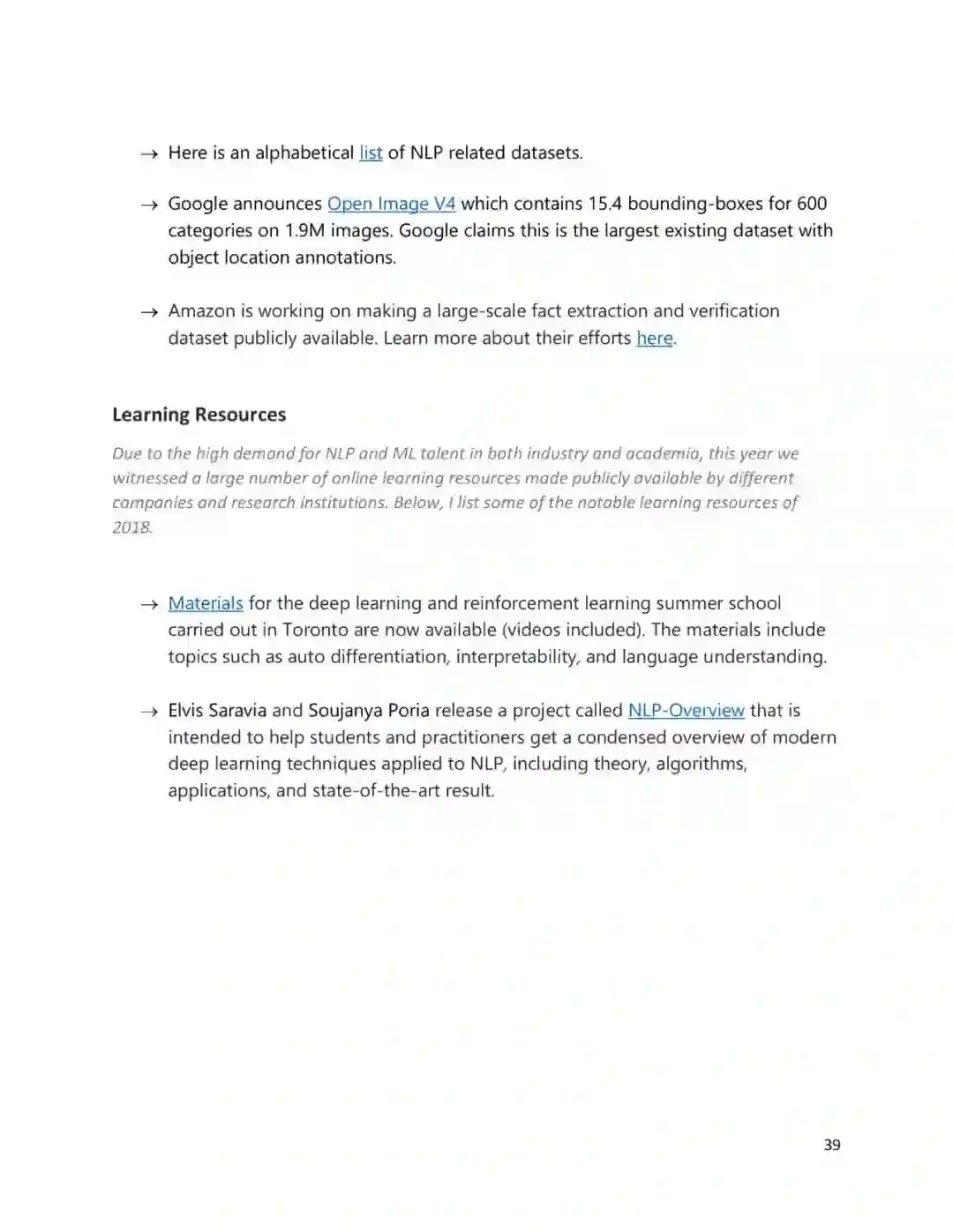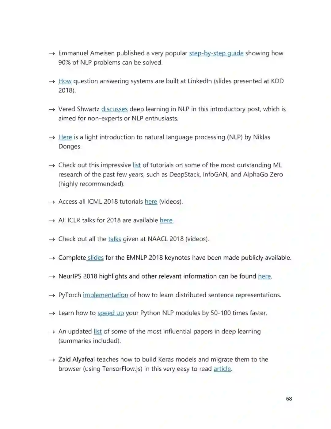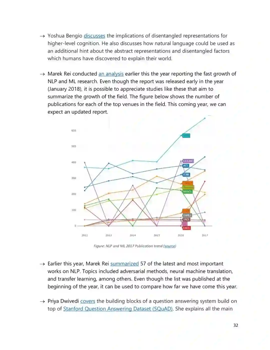 《NLP highlights of 2018》2018年学术界和工业界NLP最重要的事件和技术亮点,作者Elvis Saravia希望这份PDF可以为研究者和开发者起到指导作用(新手入门和专家进阶)。PDF的内容是dair.ai每周的NLP Newsletter的扩展汇编版本。作者将内容进行了分类,主要类别有:AI伦理学、研究出版、趋势、教育、资源、工业等。