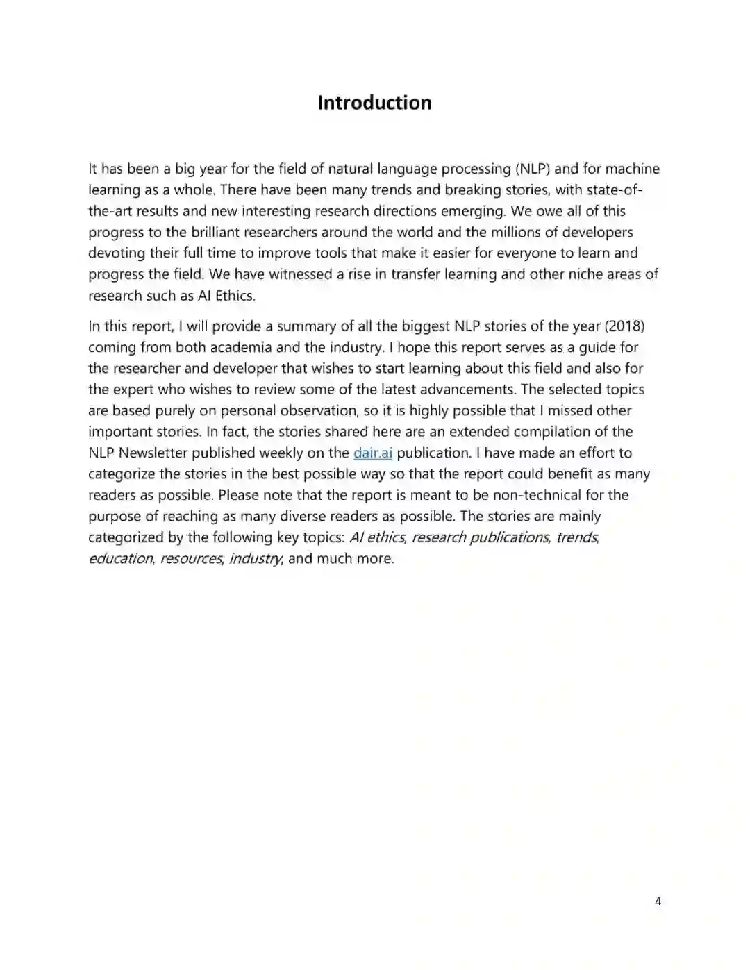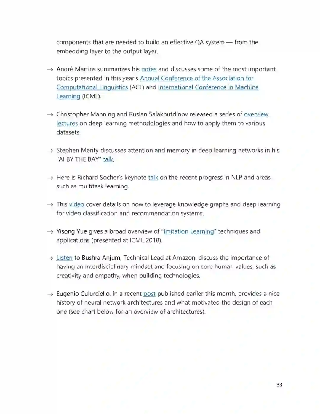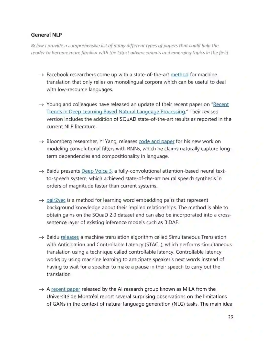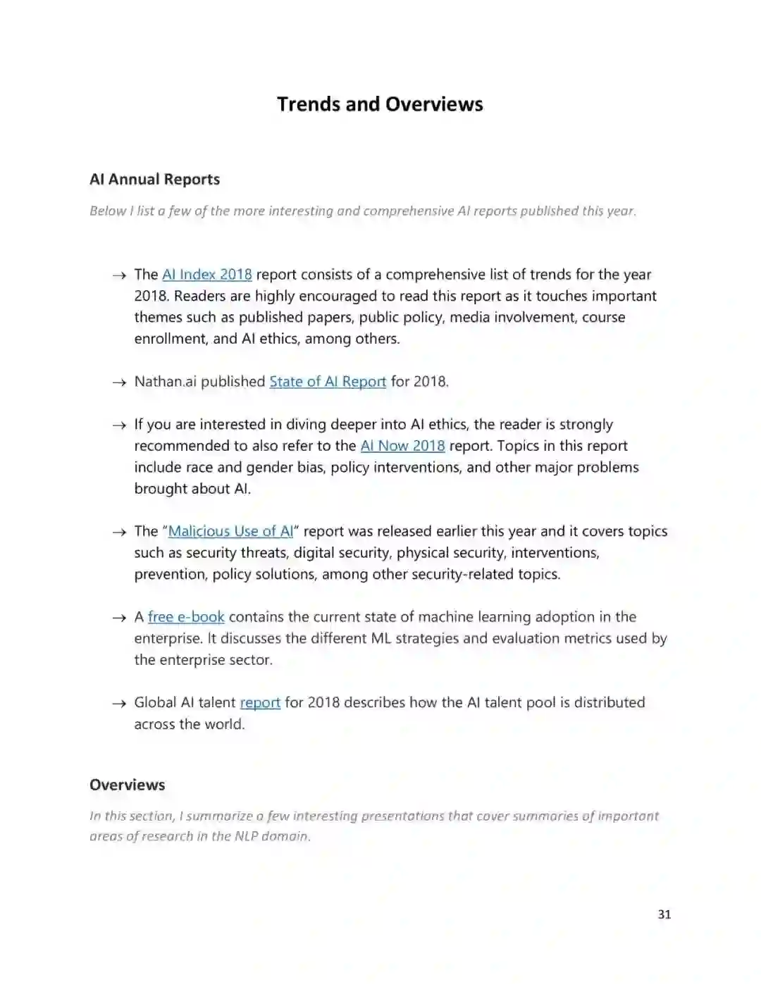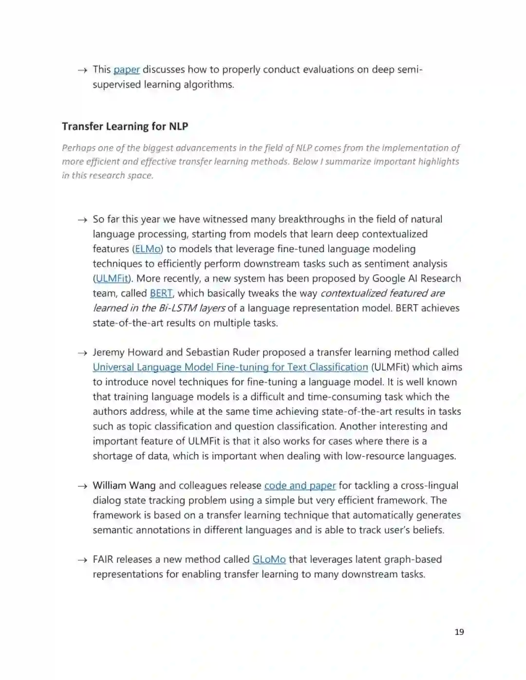 《NLP highlights of 2018》2018年学术界和工业界NLP最重要的事件和技术亮点,作者Elvis Saravia希望这份PDF可以为研究者和开发者起到指导作用(新手入门和专家进阶)。PDF的内容是dair.ai每周的NLP Newsletter的扩展汇编版本。作者将内容进行了分类,主要类别有:AI伦理学、研究出版、趋势、教育、资源、工业等。