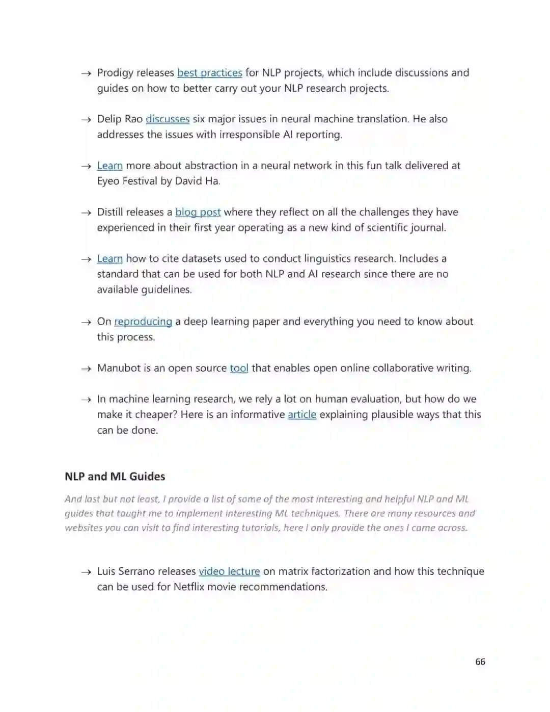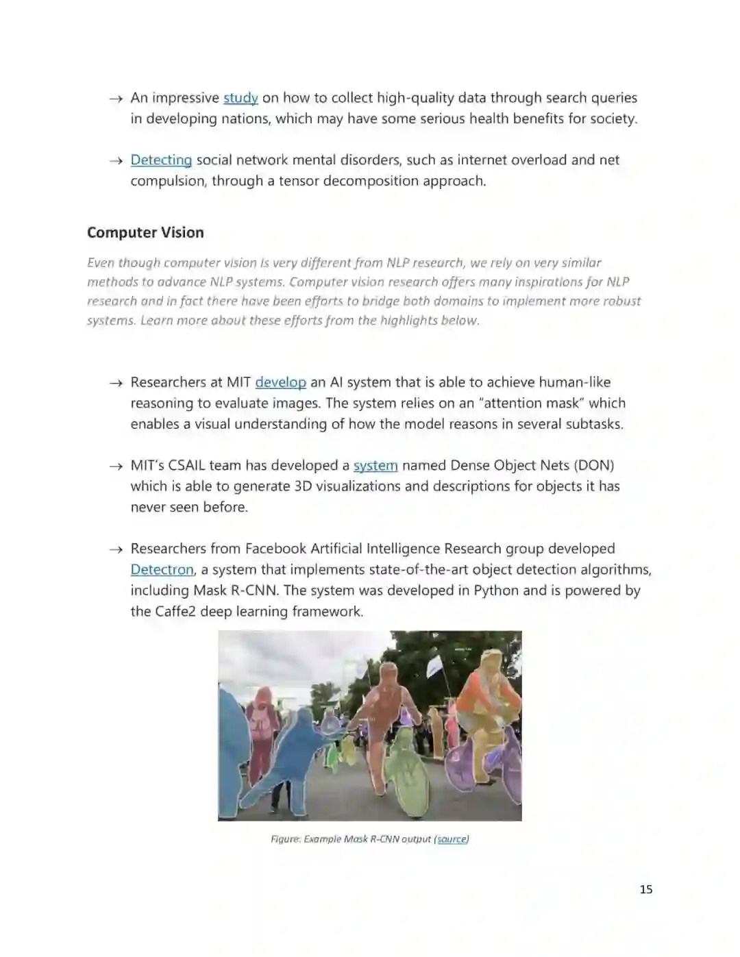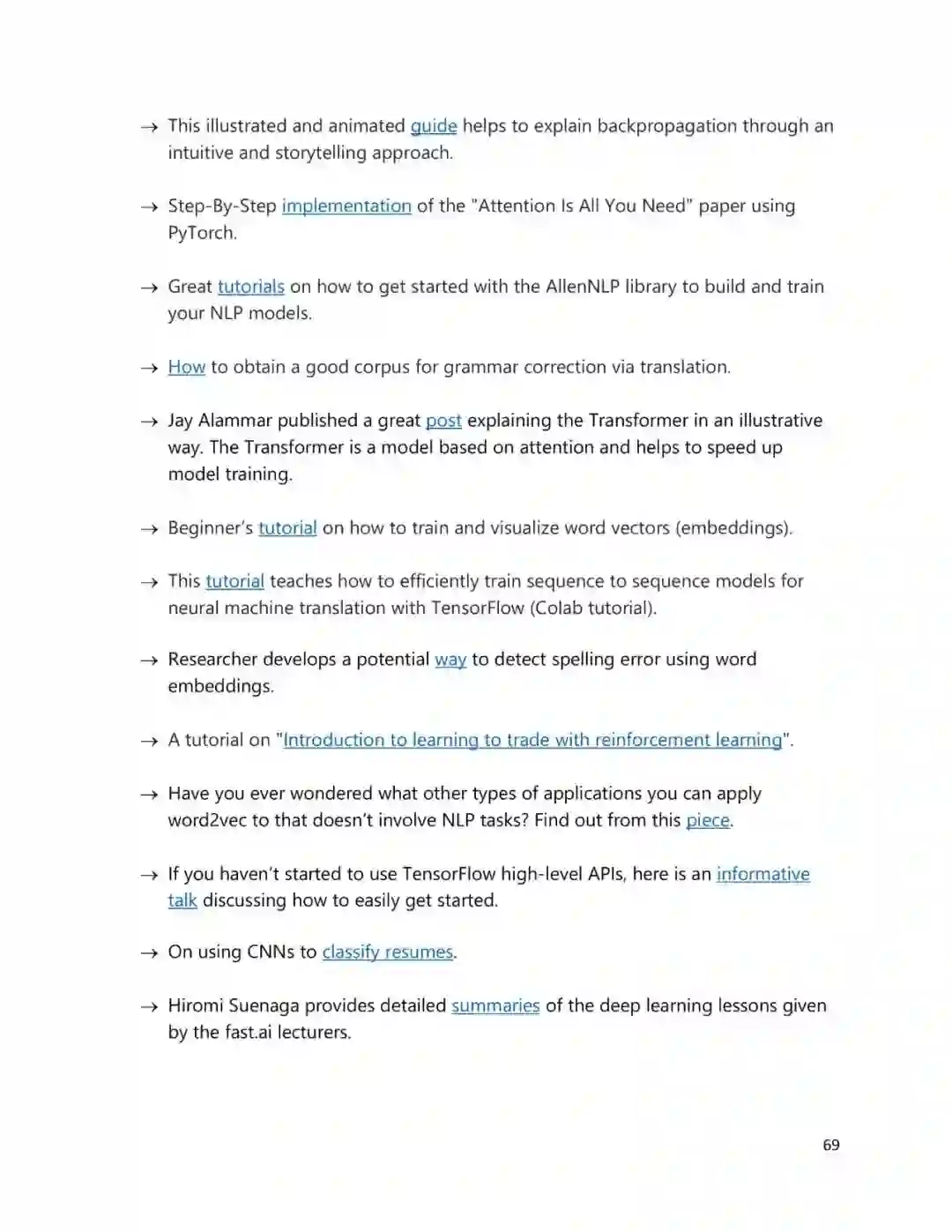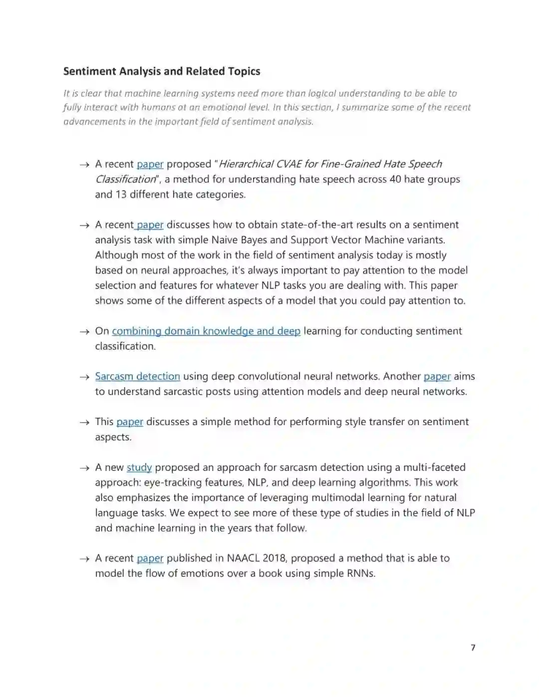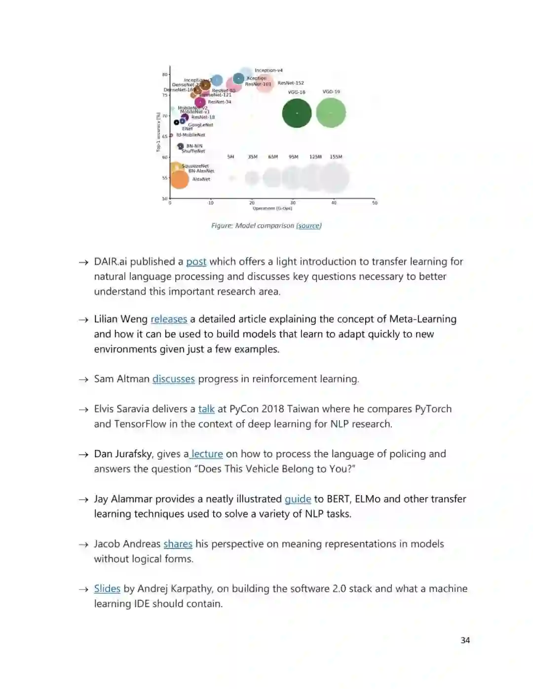 《NLP highlights of 2018》2018年学术界和工业界NLP最重要的事件和技术亮点,作者Elvis Saravia希望这份PDF可以为研究者和开发者起到指导作用(新手入门和专家进阶)。PDF的内容是dair.ai每周的NLP Newsletter的扩展汇编版本。作者将内容进行了分类,主要类别有:AI伦理学、研究出版、趋势、教育、资源、工业等。