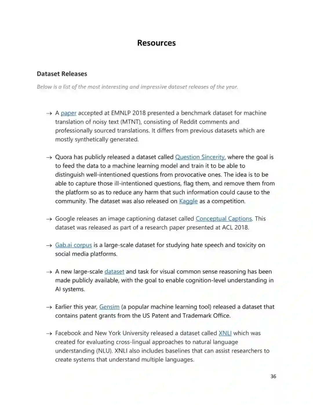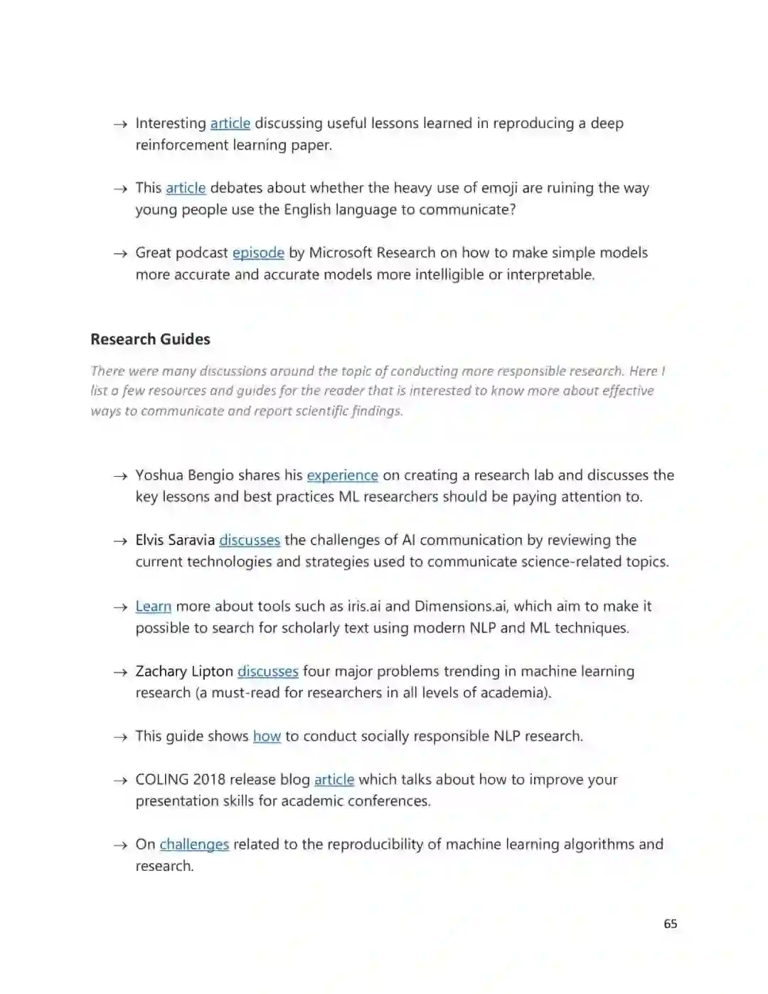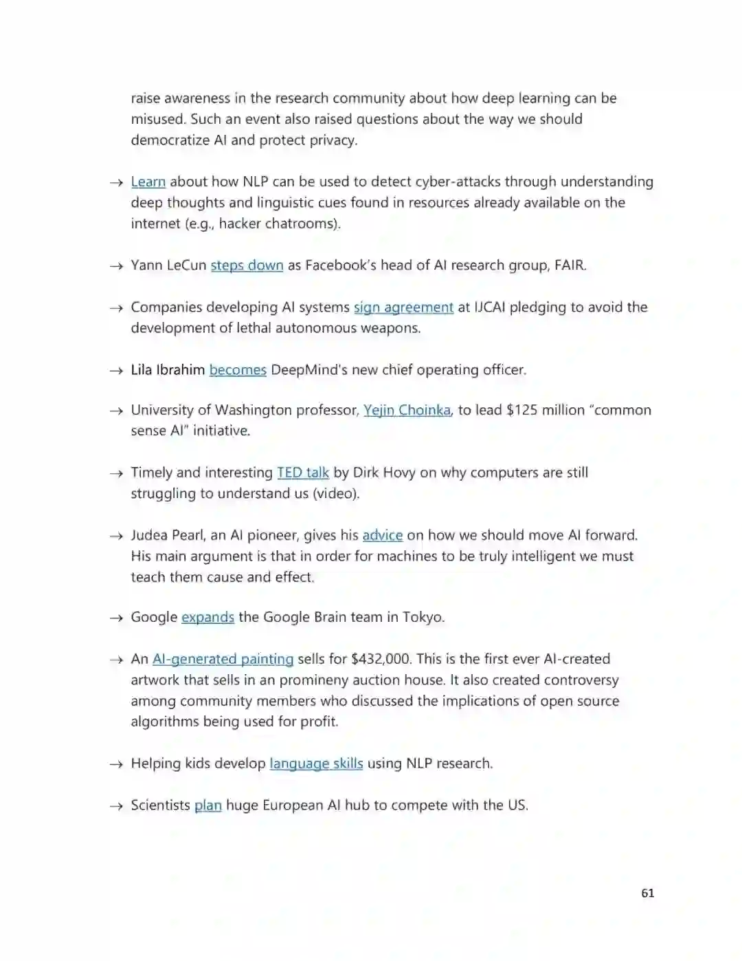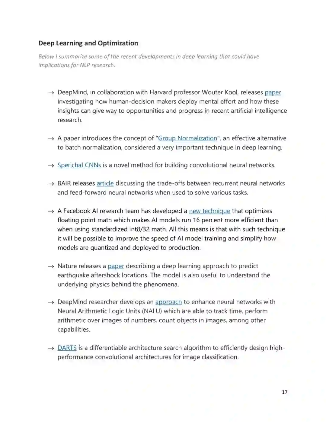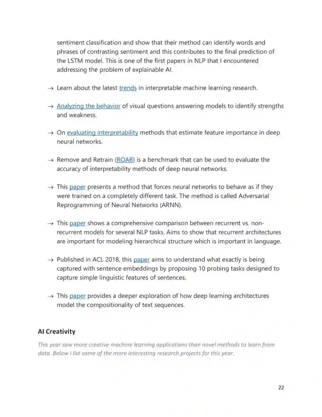 《NLP highlights of 2018》2018年学术界和工业界NLP最重要的事件和技术亮点,作者Elvis Saravia希望这份PDF可以为研究者和开发者起到指导作用(新手入门和专家进阶)。PDF的内容是dair.ai每周的NLP Newsletter的扩展汇编版本。作者将内容进行了分类,主要类别有:AI伦理学、研究出版、趋势、教育、资源、工业等。