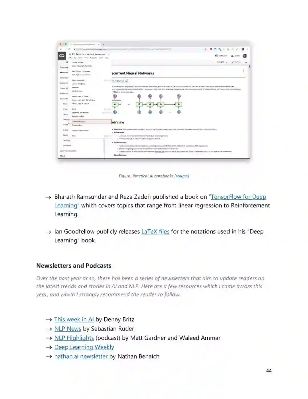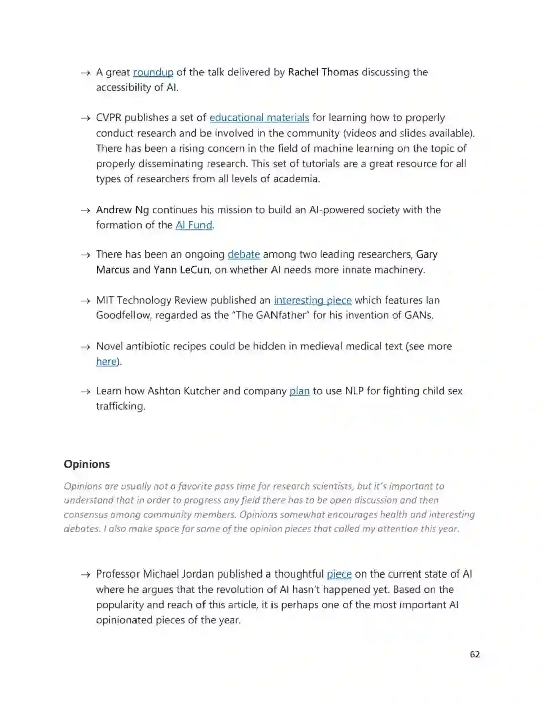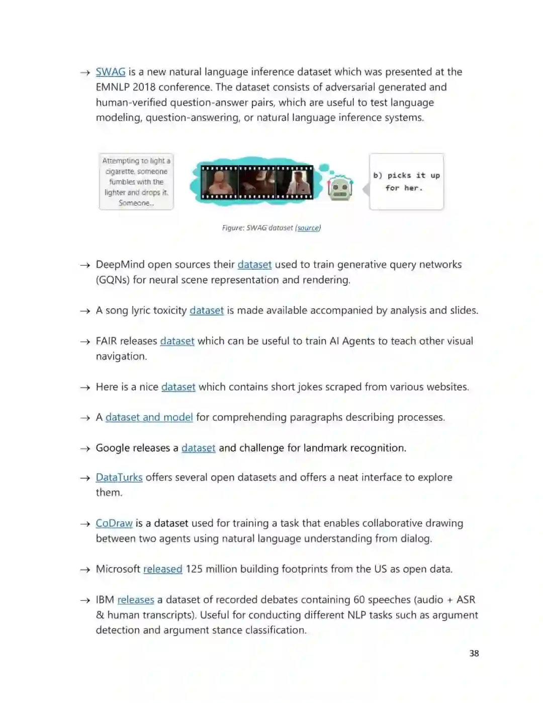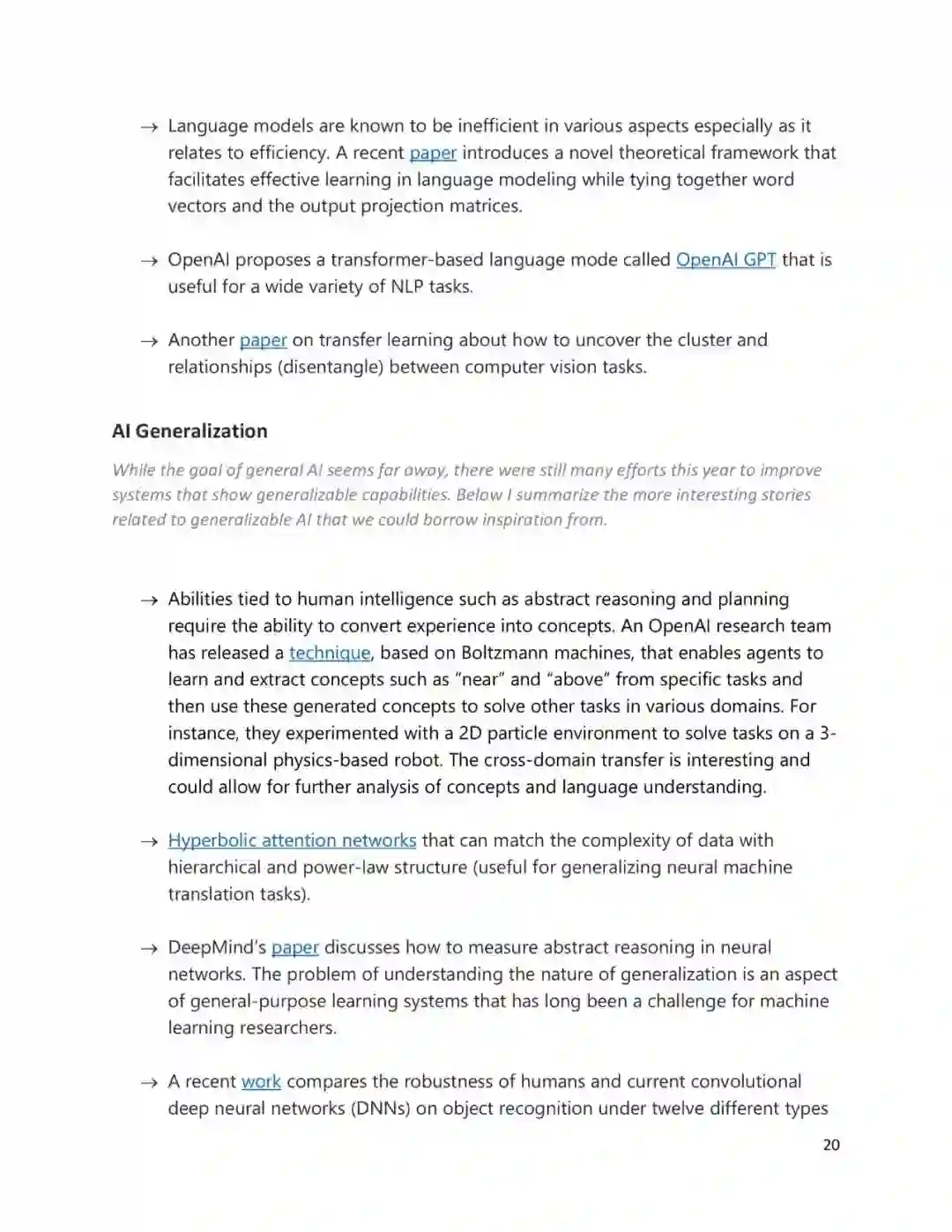 《NLP highlights of 2018》2018年学术界和工业界NLP最重要的事件和技术亮点,作者Elvis Saravia希望这份PDF可以为研究者和开发者起到指导作用(新手入门和专家进阶)。PDF的内容是dair.ai每周的NLP Newsletter的扩展汇编版本。作者将内容进行了分类,主要类别有:AI伦理学、研究出版、趋势、教育、资源、工业等。