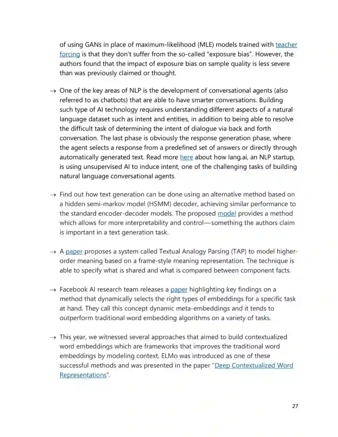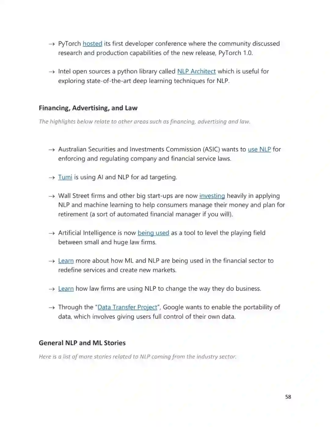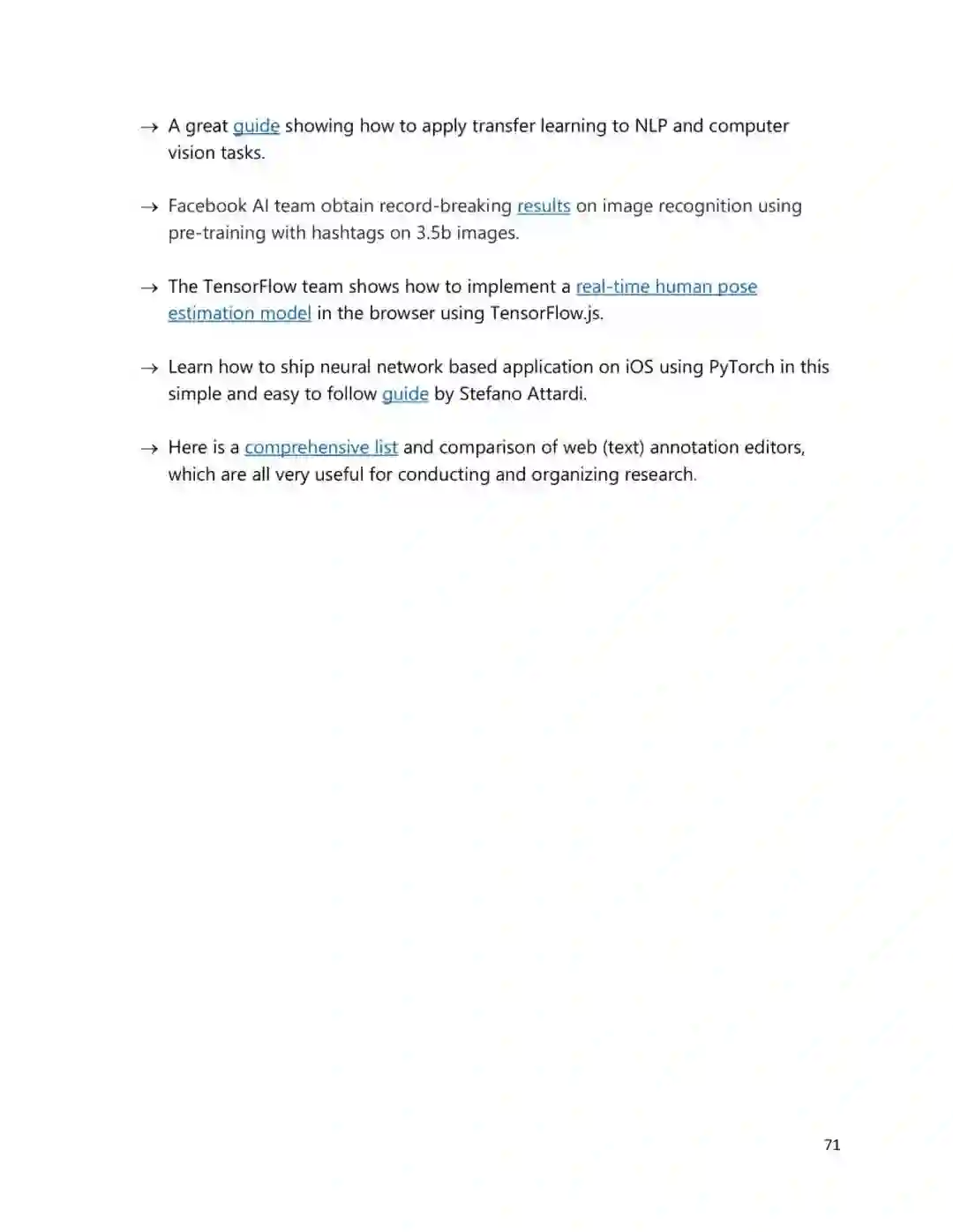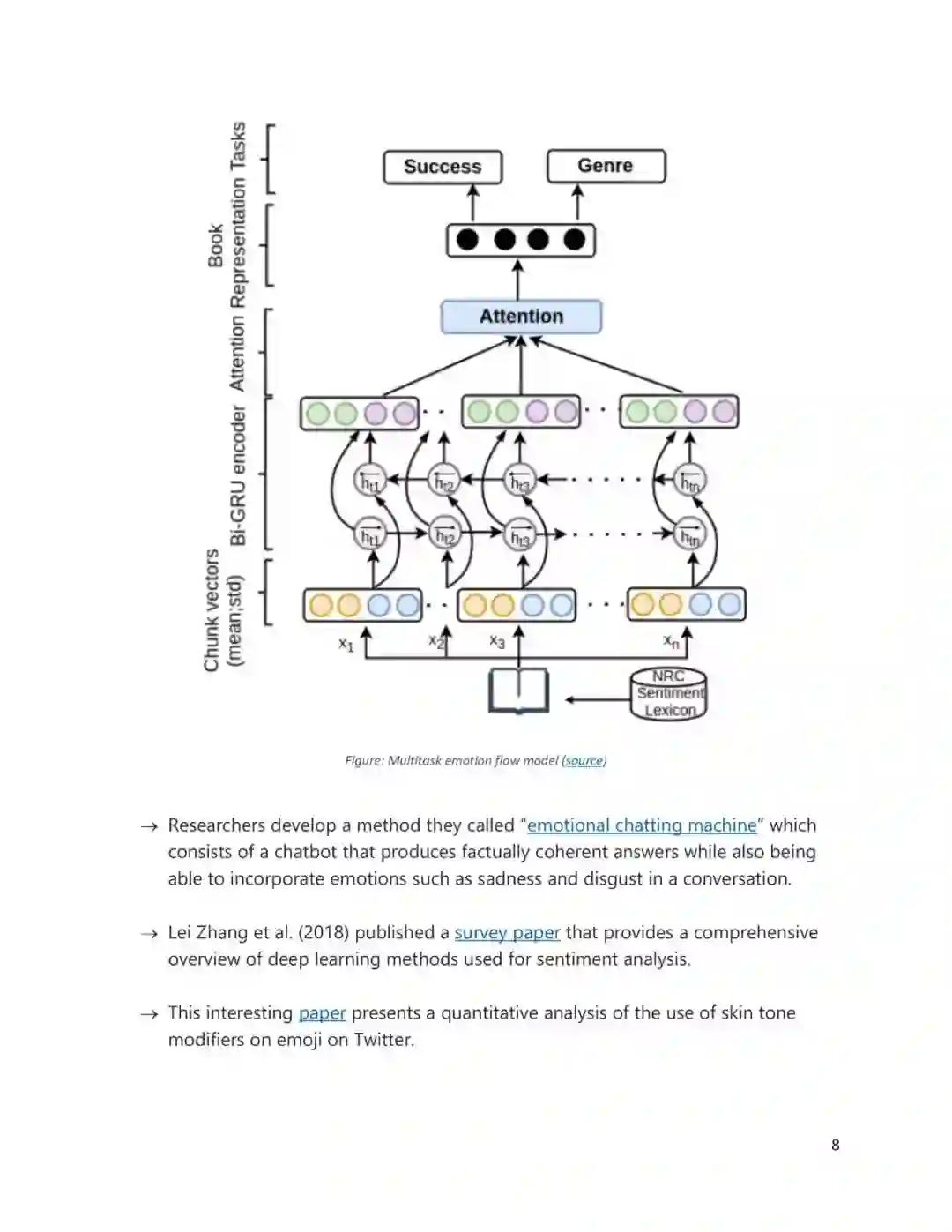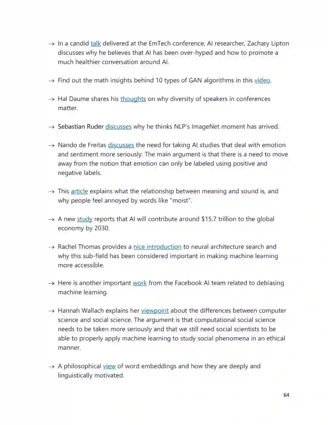 《NLP highlights of 2018》2018年学术界和工业界NLP最重要的事件和技术亮点,作者Elvis Saravia希望这份PDF可以为研究者和开发者起到指导作用(新手入门和专家进阶)。PDF的内容是dair.ai每周的NLP Newsletter的扩展汇编版本。作者将内容进行了分类,主要类别有:AI伦理学、研究出版、趋势、教育、资源、工业等。