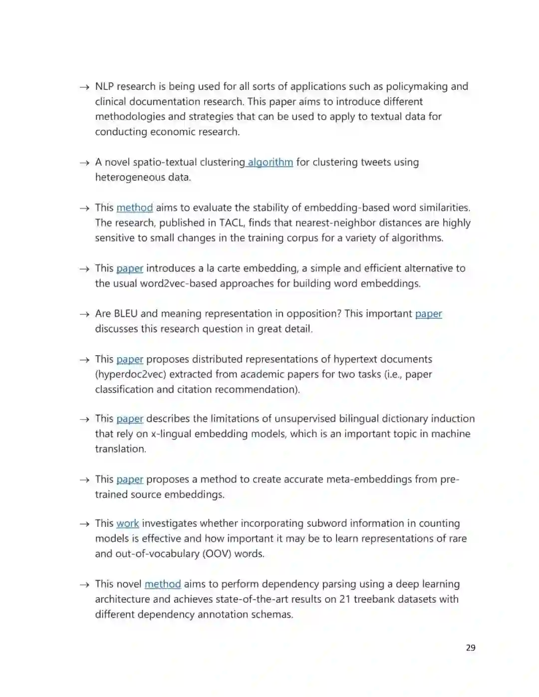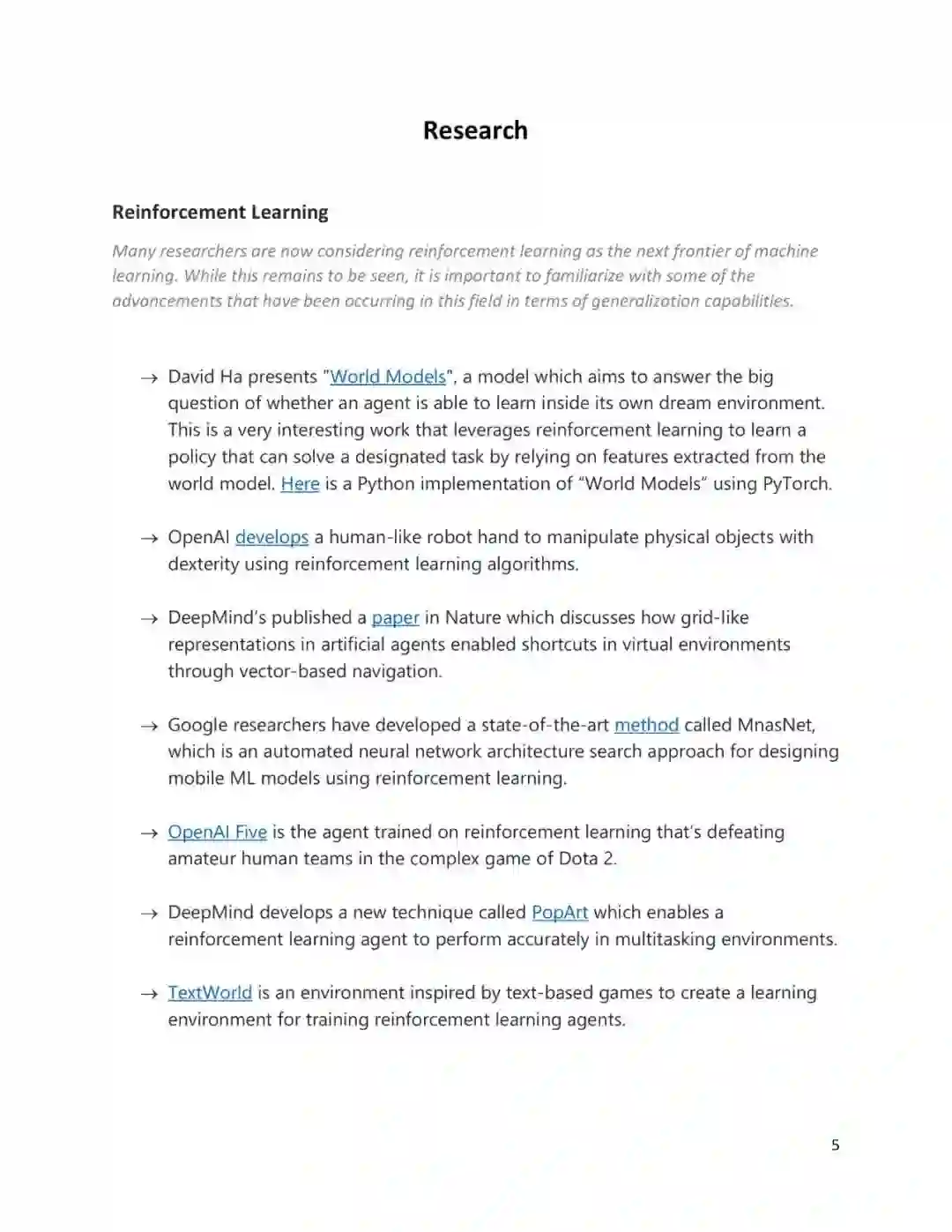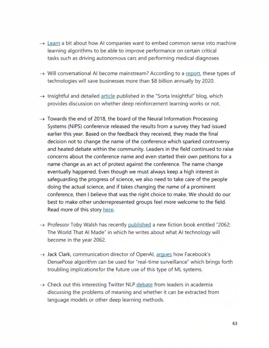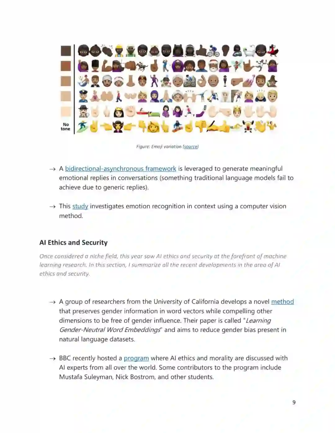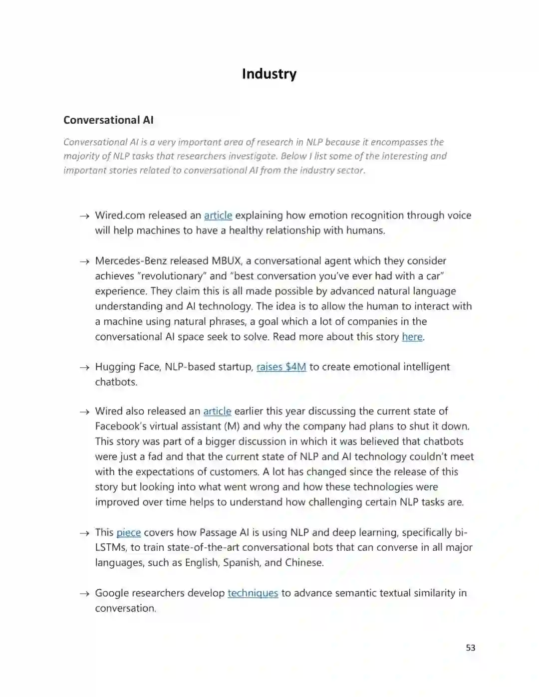 《NLP highlights of 2018》2018年学术界和工业界NLP最重要的事件和技术亮点,作者Elvis Saravia希望这份PDF可以为研究者和开发者起到指导作用(新手入门和专家进阶)。PDF的内容是dair.ai每周的NLP Newsletter的扩展汇编版本。作者将内容进行了分类,主要类别有:AI伦理学、研究出版、趋势、教育、资源、工业等。