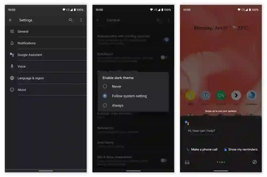 Google App (Android):在最近更新的版本中全面跟进了暗色主题,覆盖范围包括 Google App 设置界面、Google Assistant 及相关引导动画,下载安装最新版本后即可在设置中启用。