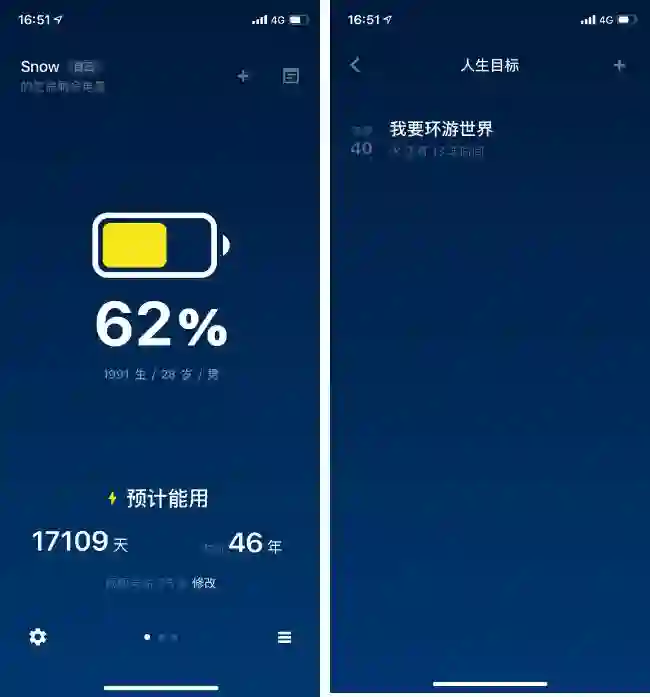 此外,在有限的时间里,你或许有许多目标需要完成,点击右上角的按钮,你可以添加人生目标和 deadline,我希望自己在 40 岁之前,能进行一次环球之旅,不知是否可以实现呢。