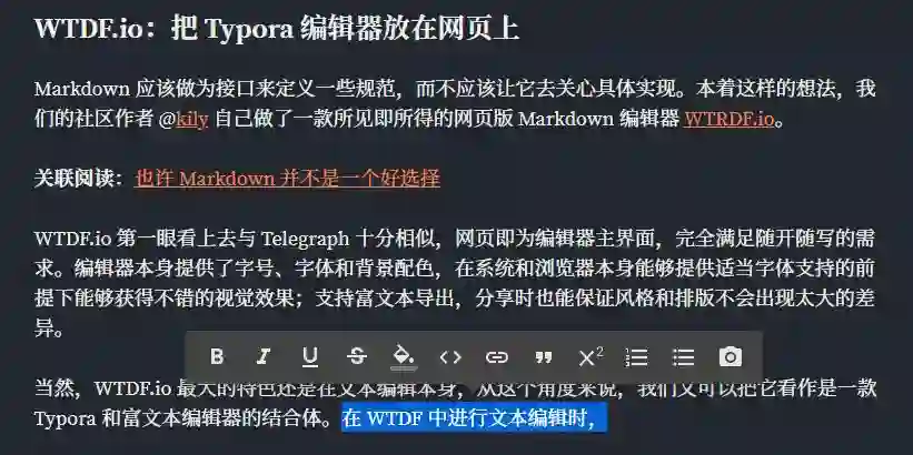 当然,WTDF.io 最大的特色还是在文本编辑本身,从这个角度来说,我们又可以把它看作是一款 Typora 和富文本编辑器的结合体:在 WTDF 中进行文本编辑时,我们既可以按照 Markdown 语法进行写作,写作的同时编辑器会直接将样式结果呈现出来;遇到 Markdown 语法较为复杂的地方,我们又可以像使用 Word 那样选字,然后通过弹出的样式工具栏对选中文本进行格式化。