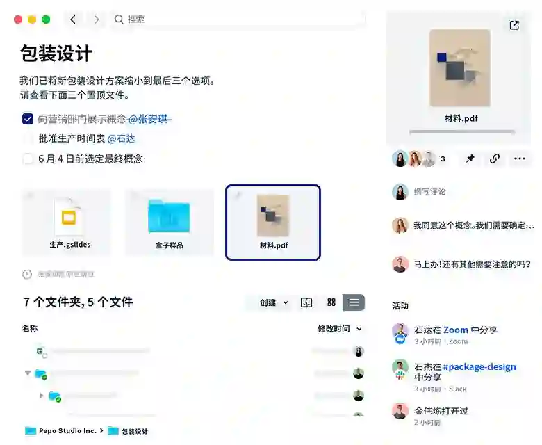 首先,你可以直接在桌面版中搜索本地文件、云端内容和快捷方式等,而不用再打开 Dropbox 的网页版了。其次,Dropbox 新增了一个「新建」功能,你可以直接在网盘内创建 Dropbox Paper、Microsoft Word、Microsoft Excel、Google Docs、Google Sheets、Google Slides 、网页快捷方式等,不用特意去第三方应用内创建了。最后,Dropbox 继续深化了自己的团队协作功能,在桌面端应用中集成了团队动态的时间流,帮助用户及时掌控团队成员的工作进度。