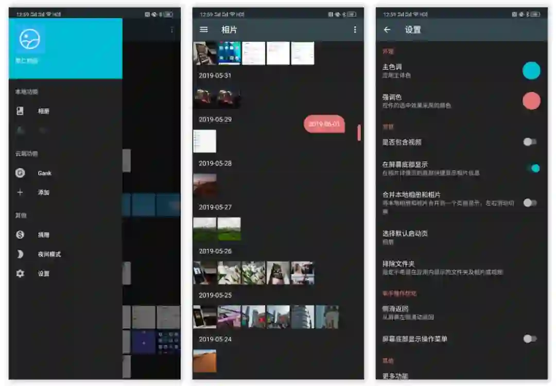 果仁相册的设计走的是简洁路线,标准的 Material Design 设计、明暗主题,加上可自定义主色调和强调色的外观自定义系统,其貌平平却也符合一款图库应用应有的「耐看」品质;功能上则同时支持本地相册和云端相册管理,前者提供了「相册」和「相片」两个管理维度,后者当前仅支持坚果云 WebDAV 同步和 Gank 在线图源。