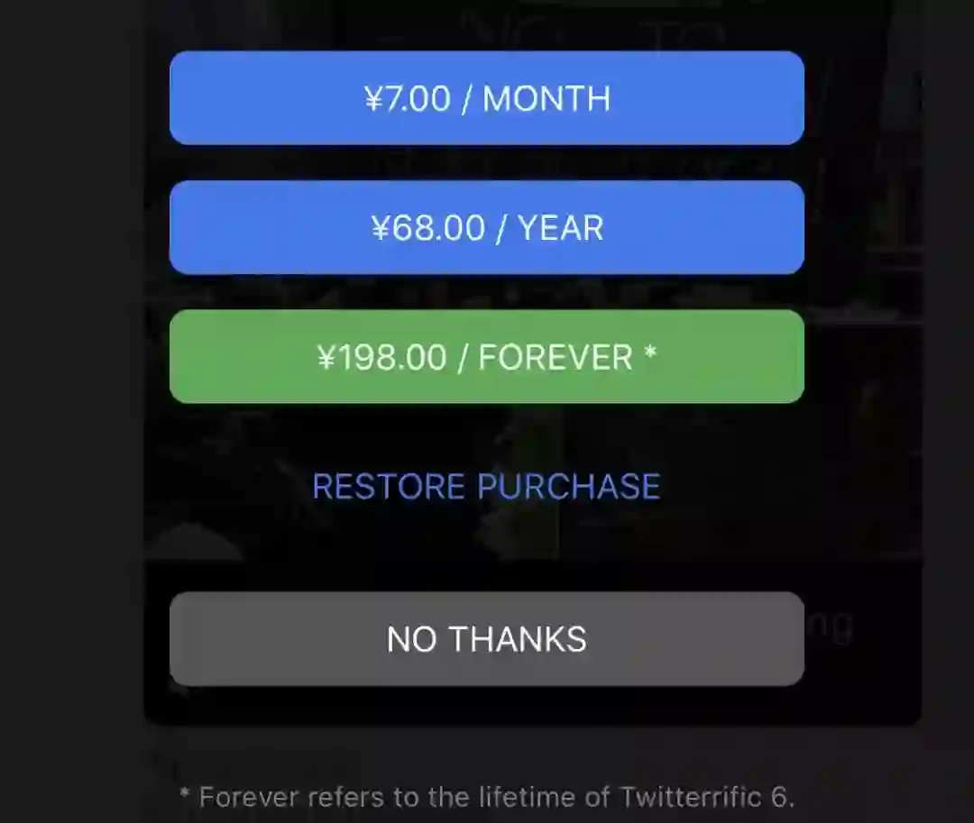Twitterrific 这次大版本升级最大的改变还是调整了自己的付费模式:全部功能免费对所有用户开放,提供了 ¥68 / 年或 ¥198 一次性买断的选项让你可以去除应用顶部的广告,其中买断制选项可以享受当前第六代大版本内的所有更新,之后的大版本更新可能需要重新付费。