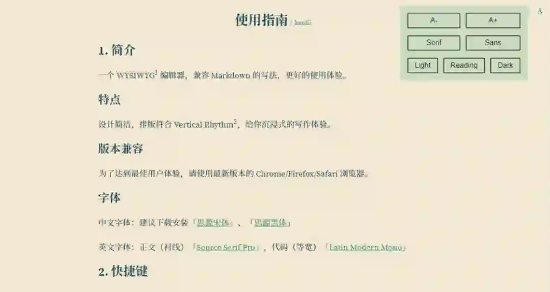 WTDF.io 第一眼看上去与 Telegraph 十分相似,网页即为编辑器主界面,完全满足随开随写的需求。编辑器本身提供了字号、字体和背景配色,在系统和浏览器本身能够提供适当字体支持的前提下能够获得不错的视觉效果;支持富文本导出,分享时也能保证风格和排版不会出现太大的差异。
