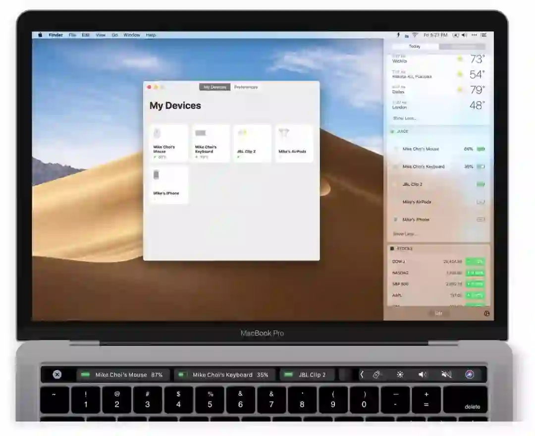 另外,Juice 很好地利用了 Mac 电脑的硬件特性,支持了 Touch Bar。只需要点击 Jucie 在 Touch Bar 上的按钮,就能快速选择你想连接的设备,这些设备的电量也会以电池图标的形式显示在 Touch Bar 上,非常直观。