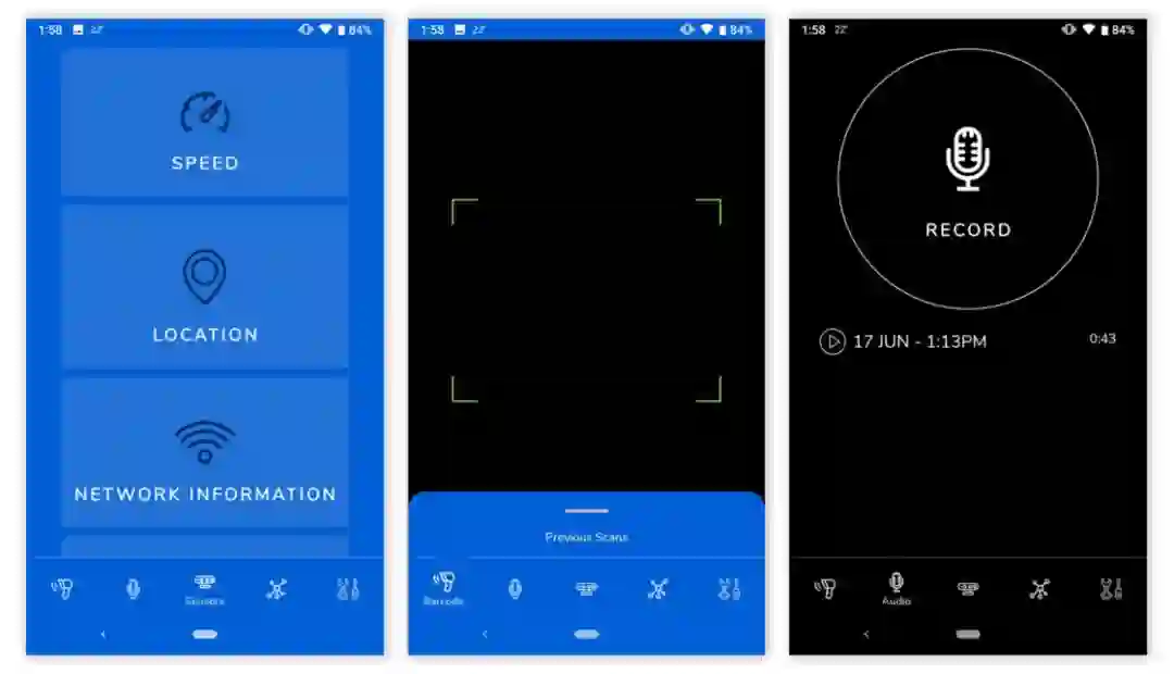 Quip 提供了四个类别的功能可供选用,每个类别的体验都不输那些同类别的独立应用:首先是扫码,授予相机权限后切换到底部左侧的二维码标签即为扫码取景框,按住取景框下方的指示横条往上一拉,便能看到此前扫到的二维码结果;录音界面的设计也简单直接,上方为录音按键,下方则是录音文件列表;然后是一些基于手机传感器的功能,例如速度、定位、网络连接状态、加速度等等,可用于驾驶、出行等等场景;最后是局域网扫描功能,顾名思义,这个功能能够帮助我们一键扫描当前 Wi-Fi 网络下的设备,在排查「非法蹭网」问题或进行网络调试的过程中能够派上用场。