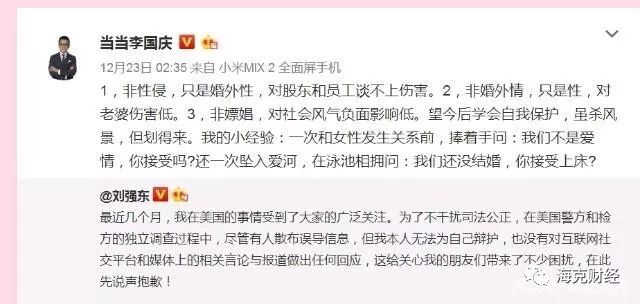 特别是在刘强东案件上,李国庆于2018年12月23日发出的有关“婚外情”、“婚外性”及个人情感经历的评点与展开,引起轩然大波,各方批判排山倒海而来。次日,当当网官微做出回应。在这份疑为当当网董事长兼CEO、李国庆妻子俞渝拟定的文稿中,当当网在强烈谴责李国庆言论之余称,李已离开当当网管理层、决策层一段时间,所有表态均属个人观点,公司已令其停用当当网logo。