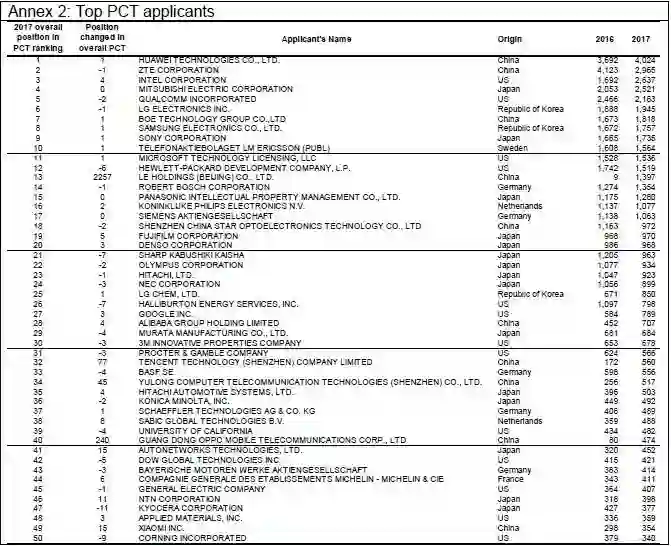今日,世界知识产权组织(WIPO)公布了2017年通过PCT(专利合作条约)提交的国际专利申请统计排名,根据该排名中兴通讯以2965件国际专利专利申请量排名全球第二。数据显示,这是中兴通讯连续第八年国际专利申请量位居全球前三,是中国唯一连续八年获此殊荣的企业。