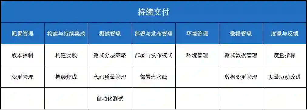 持续交付是指持续的将各类变更(包括新功能、缺陷修复、配置变化、实验等)安全、快速、高质量地落实到生产环境或用户手中的能力。在 DevOps 标准中持续交付的分级技术要求包括:配置管理、构建与持续集成、测试管理、部署与发布管理、环境管理、数据管理、度量与反馈等,如下图所示。