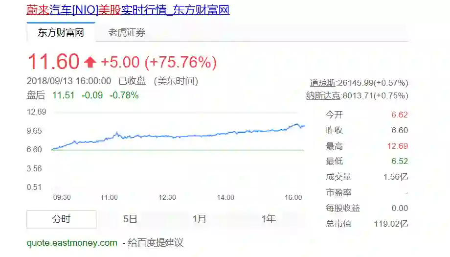 @东方财富网【中概股疯涨!蔚来汽车涨超46% 拼多多三天累计涨40%】9月14日消息,蔚来汽车上市第二日,盘中异动大涨一度超45%,刷新盘中高位至9.77美元, 随后有所回落。截至收盘,较前一日上涨达75.76%,股价来到创高位的11.60美元,总市值为119.02亿美元。