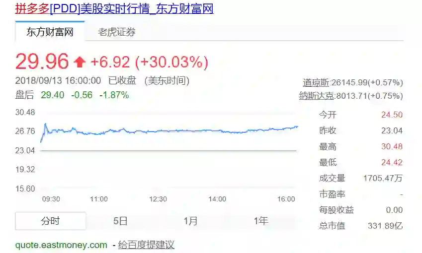 拼多多收盘大涨30.03%,股价上涨至29.96美元,为上市以来新高。拼多多已经连续五个交易日上涨,近三天累计涨幅一度超40%,总市值331.89亿美元。