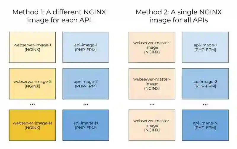 这个应用运行了 6 个以上的服务,做个乘法就知道,在开发和生产之间会有约 30 个容器。于是我决定构建一个单独的 Nginx Docker 镜像,它可以使用 PHP-FPM 的主机名作为环境变量并运行单独的配置文件,而不用为每个容器构建单独的 Nginx 镜像。