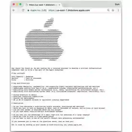 苹果网站利用一个隐藏的页面招募一名从事“关键基础设施组件”的工程师。该页面的网址是 us-east-1.blobstore.apple.com,目前已经失效。之前的内容显示,这个组件涉及 EB 级的数据、数以万计的服务器和数百万磁盘。他们希望应聘者能够设计和部署可扩展的应用和网络服务,还要熟悉 Java 8、现代服务器和分布式系统。